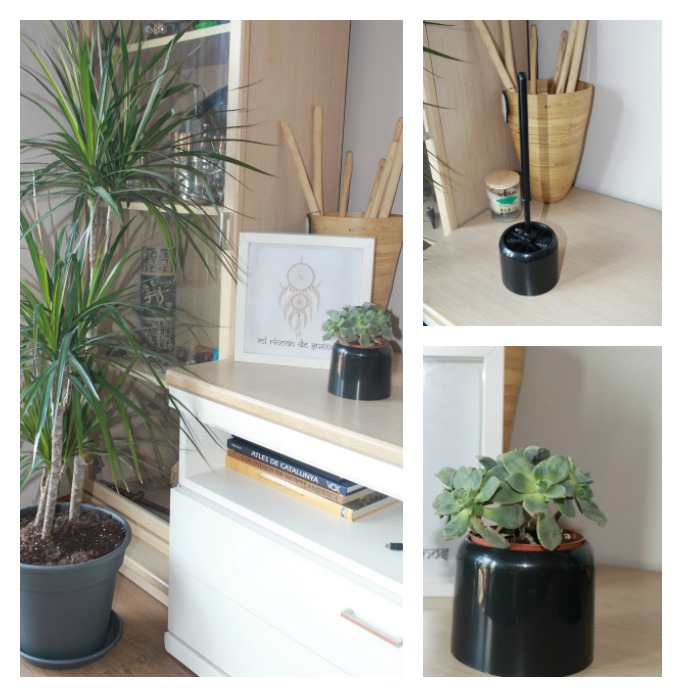Aprovechando la limpieza, compré dos escobillas para el wc en color negro, una la he puesto en el baño, y la otra, la base la he usado de macetero, claro , sin estrenarla antes.
