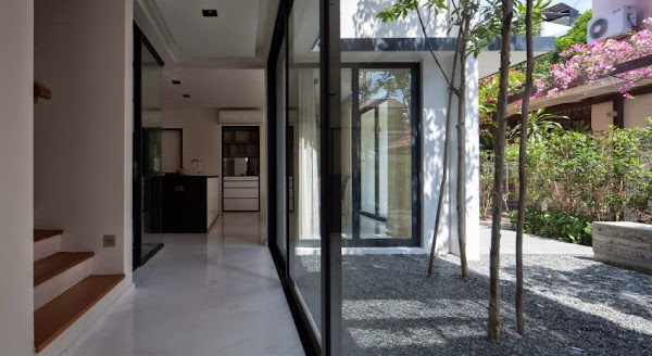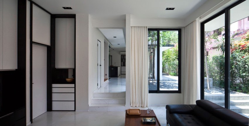 Una paleta reducida de materiales en tonos monocromáticos se remontaba a una casa colonial en blanco y negro manteniendo la coherencia en toda su arquitectura e interiores. En la elección de acabados y colores hacen eco de la fachada de arquitectura, los espacios fluyen sin problemas entre el interior y hacia fuera, permitiendo que la casa evolucione con la atemporalidad ".