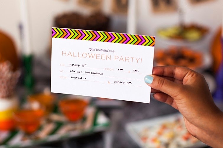Invitaciones, fáciles, fáciles! La plantilla (descargar aquí!) y un poco de washi, y quedarán perfectas! Preparamos también una guirnalda sencilla para colgar encima de la mesa de postres, que también podría ir en la puerta, o en cualquier lugar que se nos ocurra. Necesitamos plantillas de letras, una pistola de silicona, pintura acrílica, arpillera y cordeles. Estas son algunas ideas que puedes usar para decorar tus fiestas de halloween.