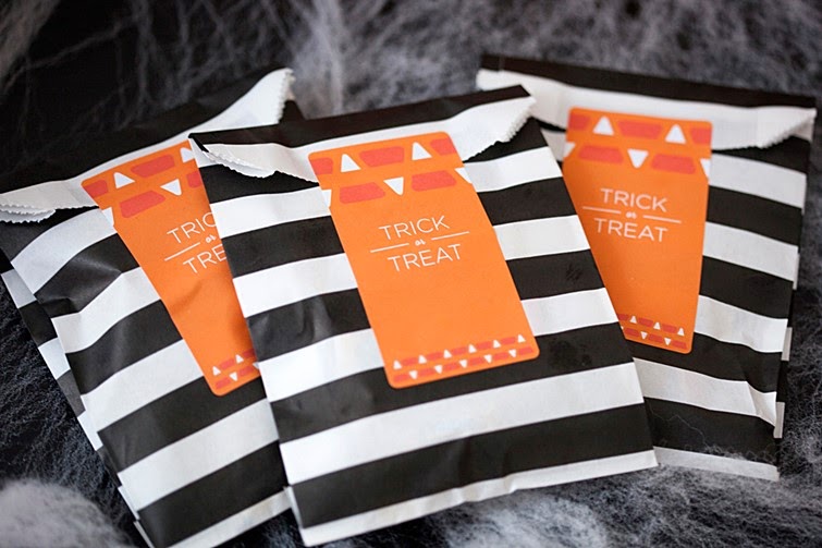 Compramos unas bolsitas de papel de rayas en blanco y negro para regalar a los invitados unas golosinas, descargamos esta plantilla con las etiquetas. Las imprimimos en papel adhesivo para etiquetas, llenamos las bolsas con caramelos, chucherías varias y listo!