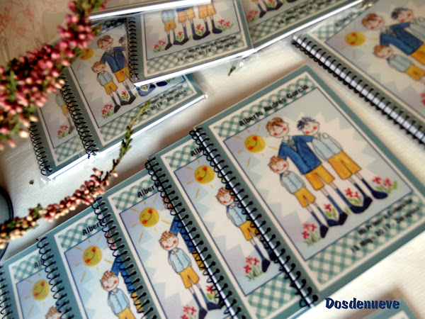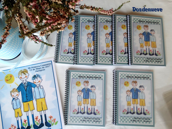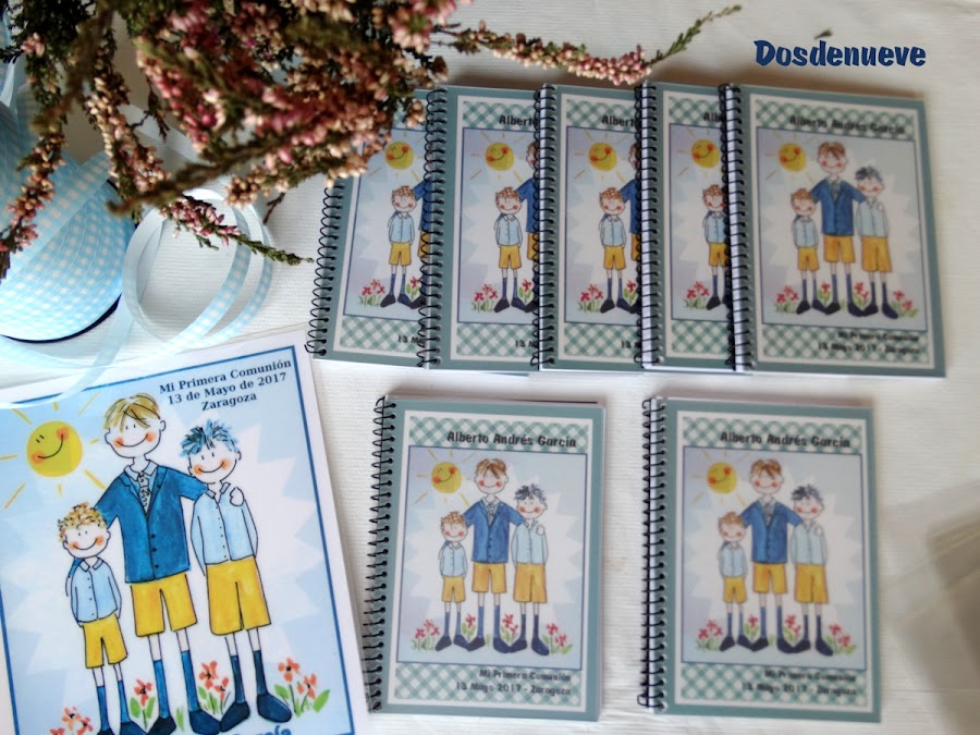 A partir de estas acuarelas hechas por Susana, yo me encargué de diseñar los marcapáginas y la portada de unas libretas, que daríamos a los invitados como recordatorio de la Primera Comunión.