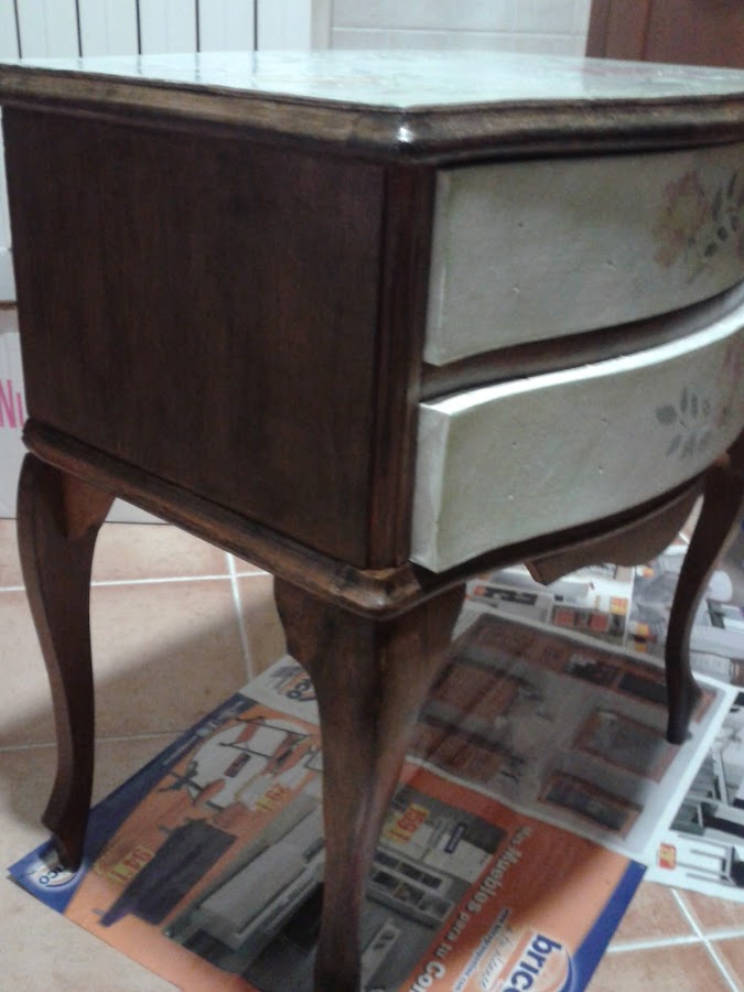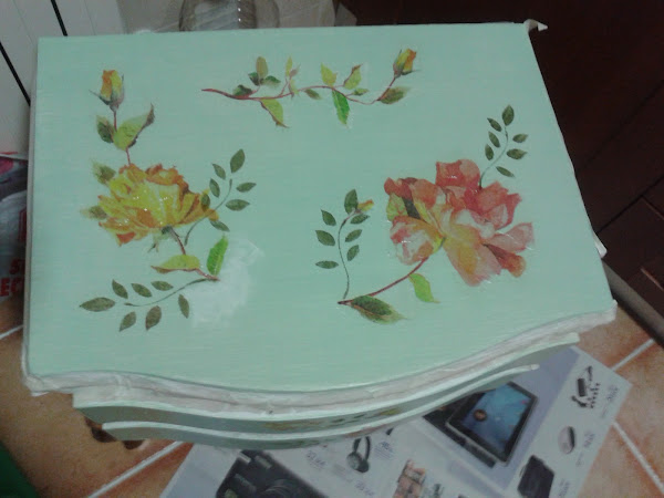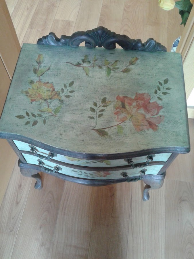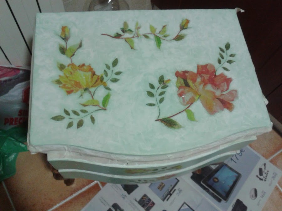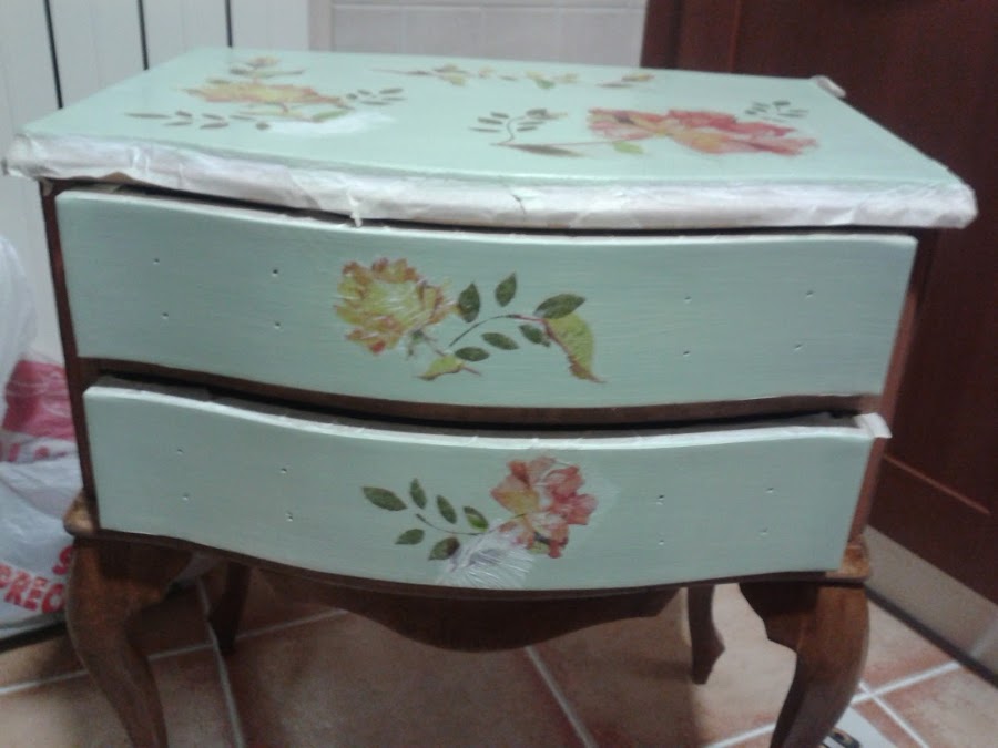 Primeramente, quité todo lo que estorba tiradores, copete, para a continuación lijar, quitar bien todo el polvo. Después le dí imprimación a todas aquellas zonas que van a ser pintadas. Luego hice una combinación de verde muy clarito para el fondo y le pegue unas flores de papel para decoupague, que se dan con alkyl por encima y con mucho cuidado porque se forman bolsas como me pasó a mí por algunos sitios.