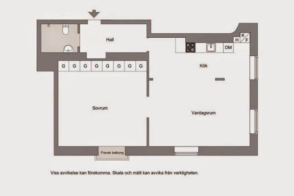 Este es el caso que nos ocupa hoy, en este apartamento de tan solo 42m2 se unifican las estancias. Desde el hall o entrada accedemos por un pequeño pasillo a una única habitación compartida por cocina y salón. Un espacio que gracias a que no se ha abusado del mobiliario y que este además es de gran ligereza visual, ( como las sillas en un material transparente) la percepción óptica nos engaña y sus dimensiones parecen mas grandes que en lo que realidad son.