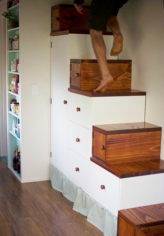 Cada vez es más habitual dar una segunda utilidad a las escaleras. en esta ocasión se ha hecho un armario frontal donde cada escalón es un cajón diferente.