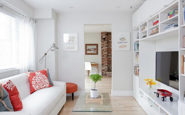 Se parte de dos estancias independientes y separadas entre sí, con materiales un poco desfasados que no aportan la luz necesaria ni el estado de confort que los dueños necesitaban.Con el nuevo diseño y decoración se crea un espacio único completamente unificado en tonalidades y color, donde los acentos vibrantes y alegres los pones los accesorios sobre una paleta de color en blanco.