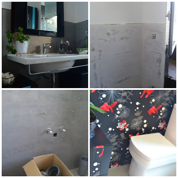 Tuvimos que cambiar de pared el lavabo, en dicha pared quedaban las tomas de agua y varios agujeros a la vista. Para solucionar esto y partiendo de que no queríamos hacer mucho destrozo decidimos colocar un papel para tapar esos agujeros. Aplicamos el producto directamente encima del revestimiento cerámico y listo! Elegimos un papel especial para baños en negro con dibujos en rojo y blanco porque aunque el baño es pequeño tiene muy buena iluminación.