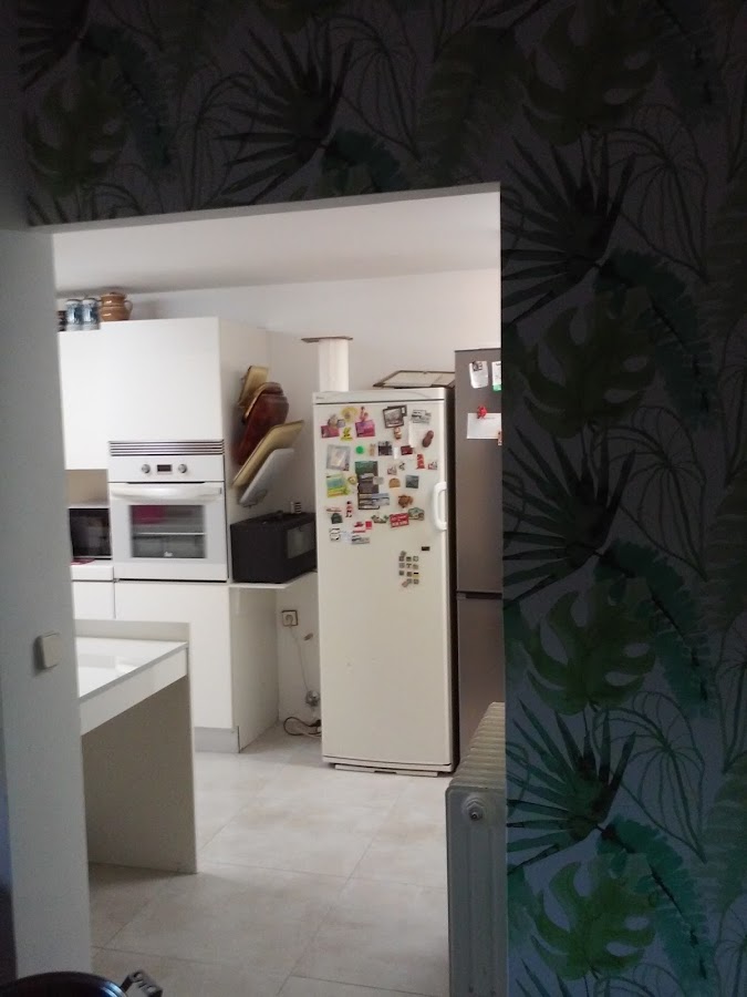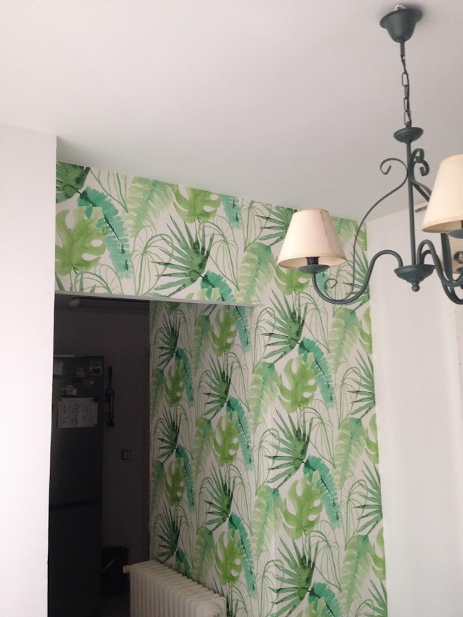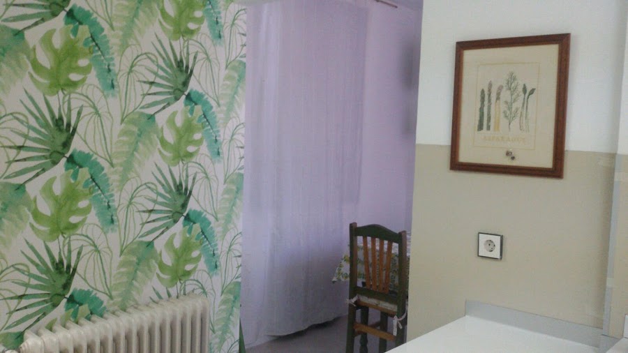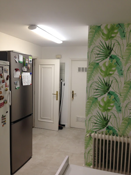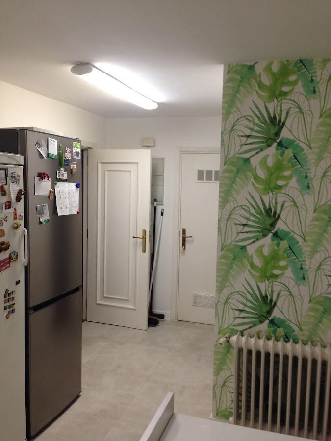 Como no queríamos que se viera tampoco demasiado blanca, y resultara sosa, los azulejos se han recubierto por un panelado de formica color beige, coordinando con el suelo. Y para dar contraste, y alegría seleccionamos un papel en leroy merlin, haciendo juego con el mobiliario del office, que es el que le ha dado la personalidad y el carácter a la cocina.