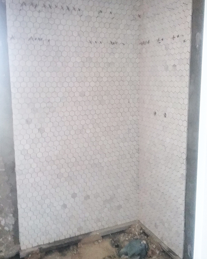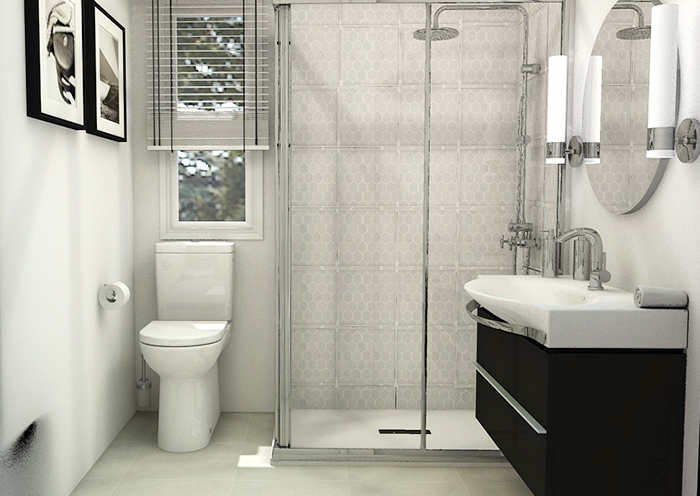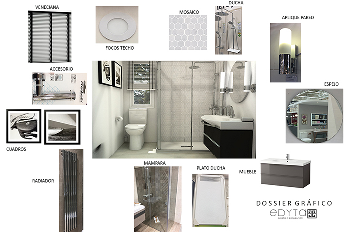 Para la zona de ducha, seleccioné un mosaico de mármol hexagonal blanco con beta gris, un suelo porcelánico en gris, el mueble del lavabo negro y accesorios y perfilería de la mampara cromados.
