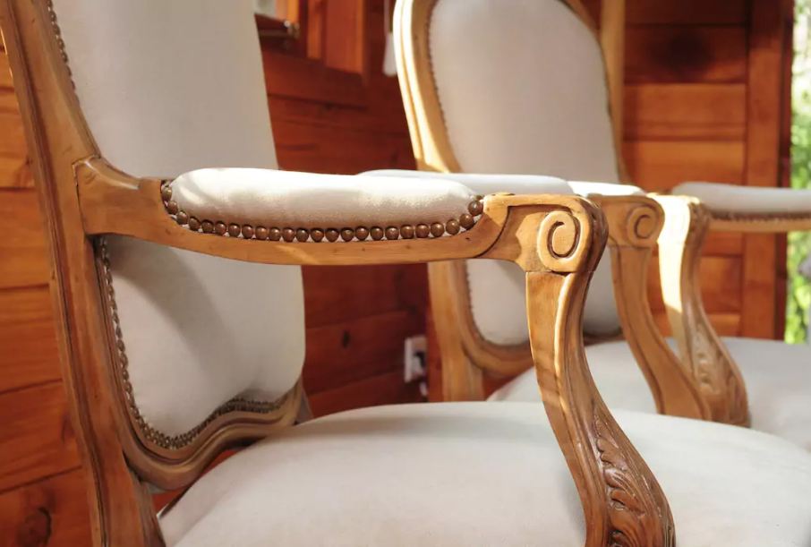 En el living, un sillón contemporáneo de líneas rectas, tapizado en ecocuero negro, es el contraste perfecto para los silloncitos individuales de estilo Luis XV. Se les dio un aspecto actual al tapizarlos en tonos claros y al darle a la madera una terminación muy natural. Los almohadones y la alfombra aportan el toque de color.