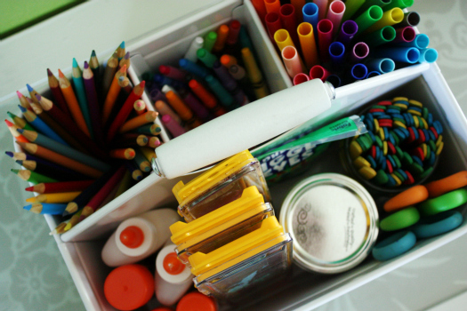 No nos olvidemos de los niños, para ellos nada mejor que un organizador ¡para el artista de la casa!. Coger una cesta con compartimentos (la puedes encontrar en Ikea) y llenarla con rotuladores, plastidecor, ceras, temperas, tijeras, pegamento,..)
