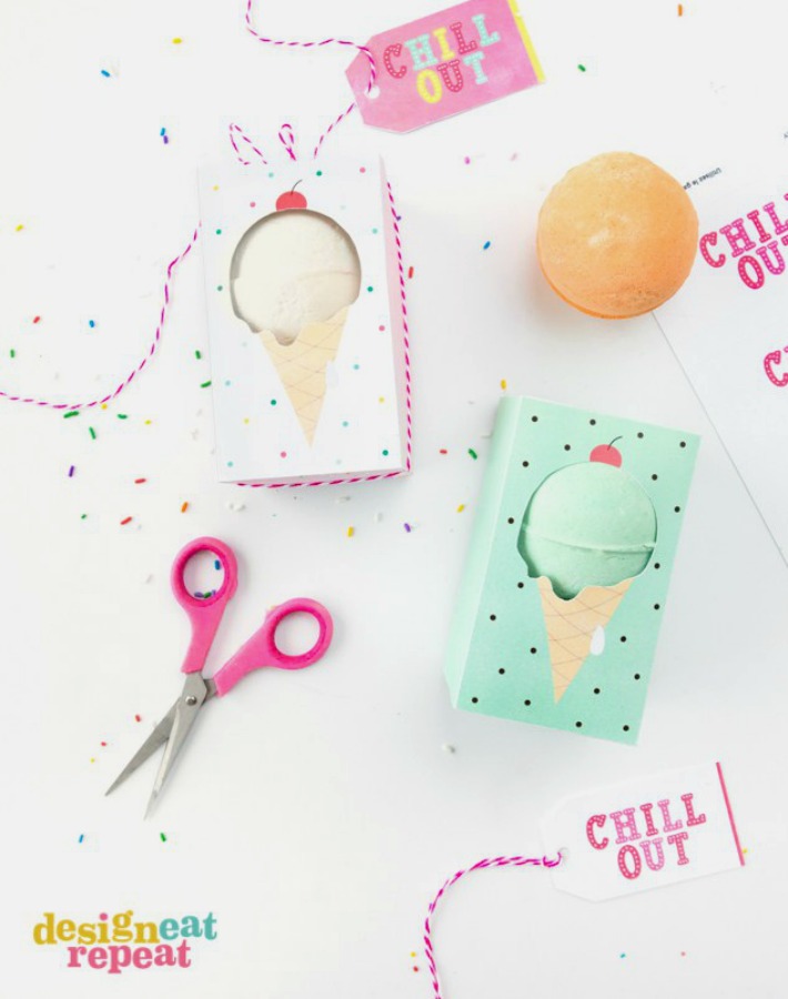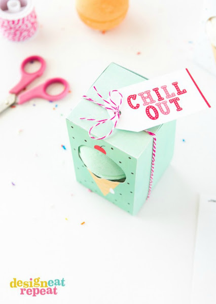 Una vez tenemos nuestras bombas de jabón hechas nos falta la caja bonita para entregarlas. Esta idea del blog designeat repeat es perfecta ¿No me digáis que nos es original esta cajita en la que parece que estamos entregando un helado?