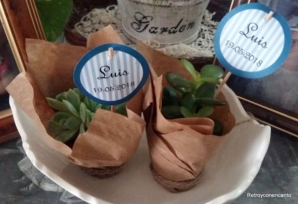 Hace unos días, como es normal en esta época, una de nosotras acudió a la tierra de su madre, Ronda, a la celebración de la Primera Comunión de uno de sus sobrinos. Fue una ceremonia preciosa, participativa y muy musical. En el ágape posterior se disfrutó de lo lindo en compañía de familiares y amigos a los que sólo vemos cuando nos desplazamos a tan espectacular ciudad... La entrada al salón donde almorzamos, con unos cuantos escalones de fácil acceso, estaba salpicada de pequeñas plantas (esta semana nos ha dado por ellas....) con el nombre del homenajeado y fecha tan significativa. Fue el obsequio que cada invitado se llevó a casa como recuerdo del día especial. Nos gustó el detalle. Regalar Vida siempre es un acierto, y si además viene envuelto con tanto amor, ¡mejor que mejor! ¡Felicidades, Luis!