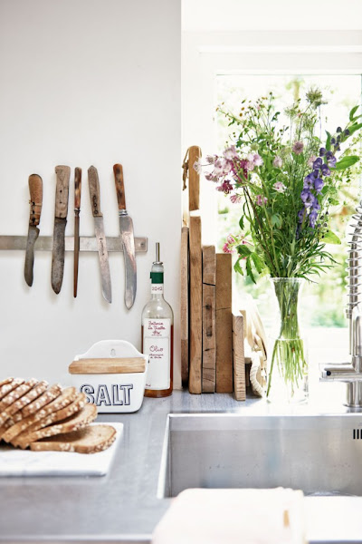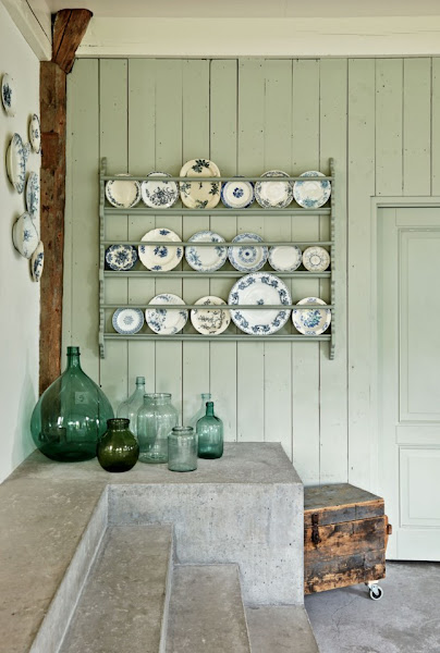 Esta vieja granja en Workum, al norte de los Países Bajos, ha sido completamente renovada y es ahora un hogar familiar donde la preciosa cocina es el corazón de la casa, lo que más me gusta de este tipo de rehabilitaciones. Absolutamente llena de luz y con un inmensa mesa de madera en la zona central, invita a pasar las horas en ella en compañía. El resultado de la reforma aporta un estilo sencillo, rústico y que da un aspecto de interior vivido y personal. Los complemento y objetos son los protagonistas y con ellos se crean grupos: las plantas a un lado, a otro lado fanales que convierten juguetes en objetos preciados, damajuanas, platos, naturaleza muerta colgada de las paredes, colecciones de mariposas... Al ser una granja, los espacios resultantes son grandes y abiertos. Con un cierto aire entre nórdico e industrial, la cocina tenía que tener la encimera de acero inoxidable, práctica, resistente y también higiénica, donde su dueña pudiera elaborar deliciosos platos.