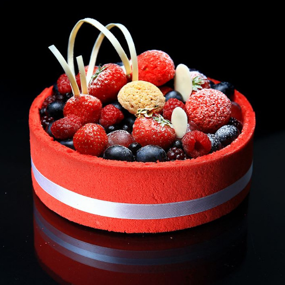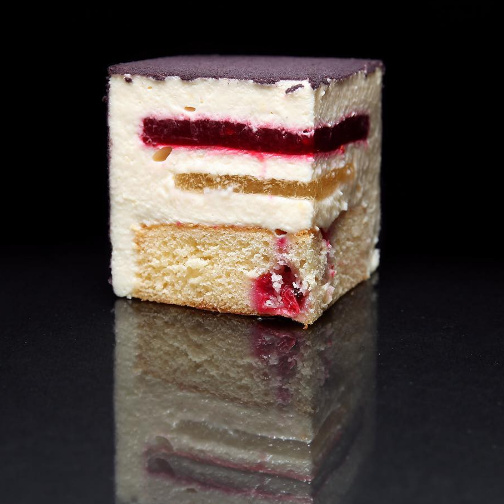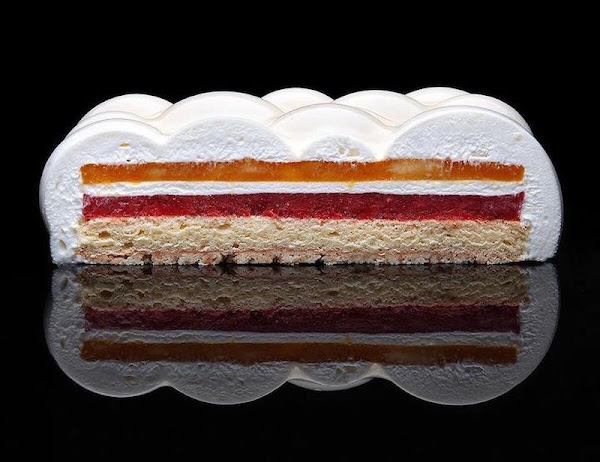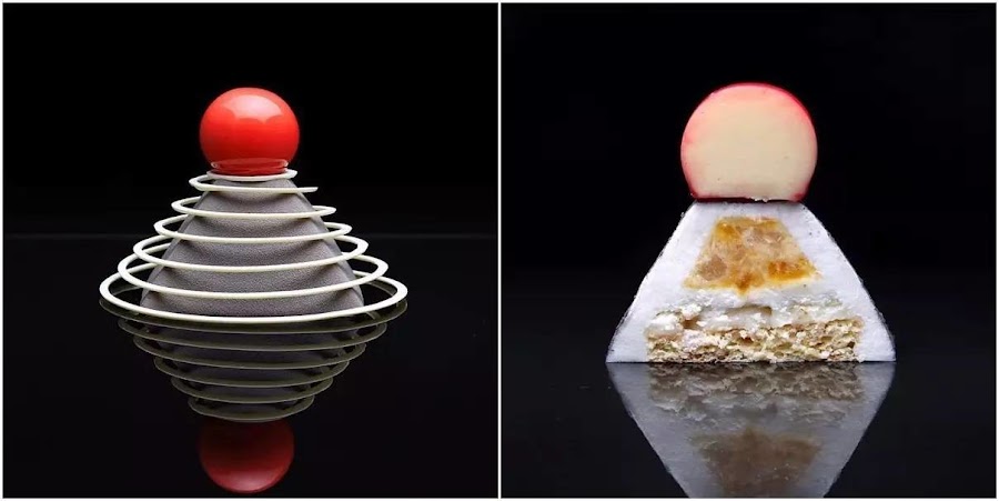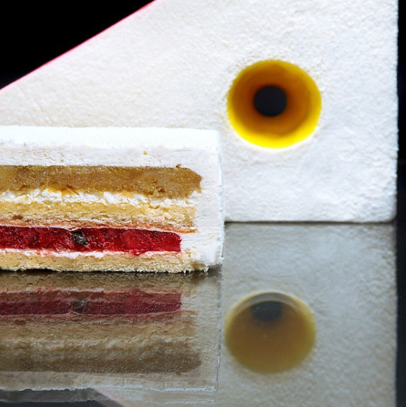 Y los postres en si son un auténtico espectáculo en cuanto a diseño minimalista y ejecución de la obra. Son pasteles pensados en alzado, pero sobre todo en sección. Esos cortes que consigue son otra obra de arte del diseño, pensado absolutamente desde el comienzo de todo el proceso creativo.