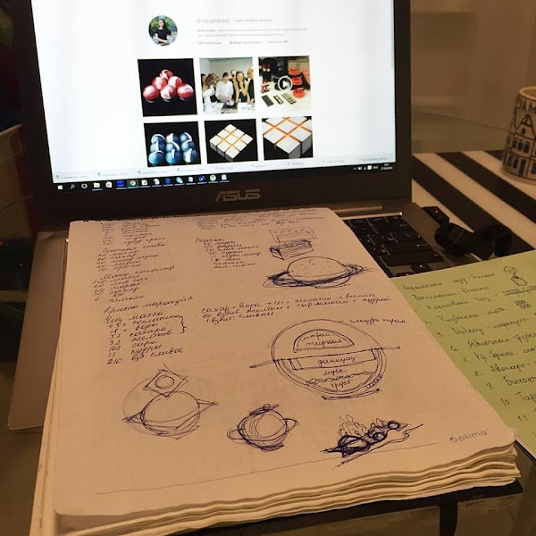 Aquí podemos ver cómo sus obras comienzan con un boceto a mano sobre papel: