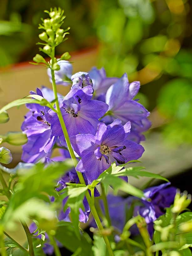 Un portavelas marroquí junto a una maceta plantada de hierbas aromáticas en el mismo color