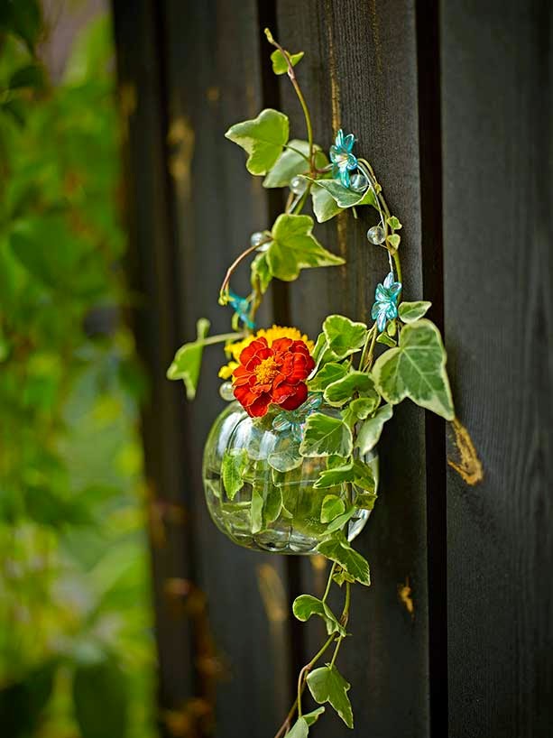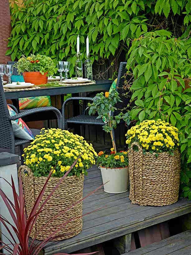 Los crisantemos franquean la entrada a la terraza en bellísimas macetas de mimbre