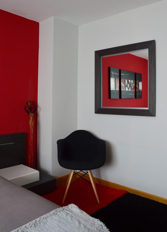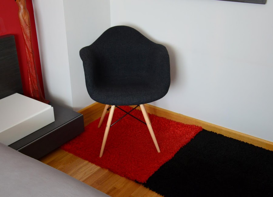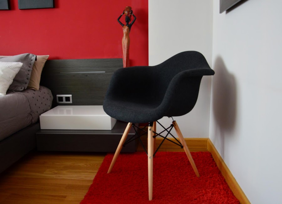 Para vestir aún más la estancia, acompañamos la silla con dos alfombras cuadradas, de pelo largo, en color rojo y negro,