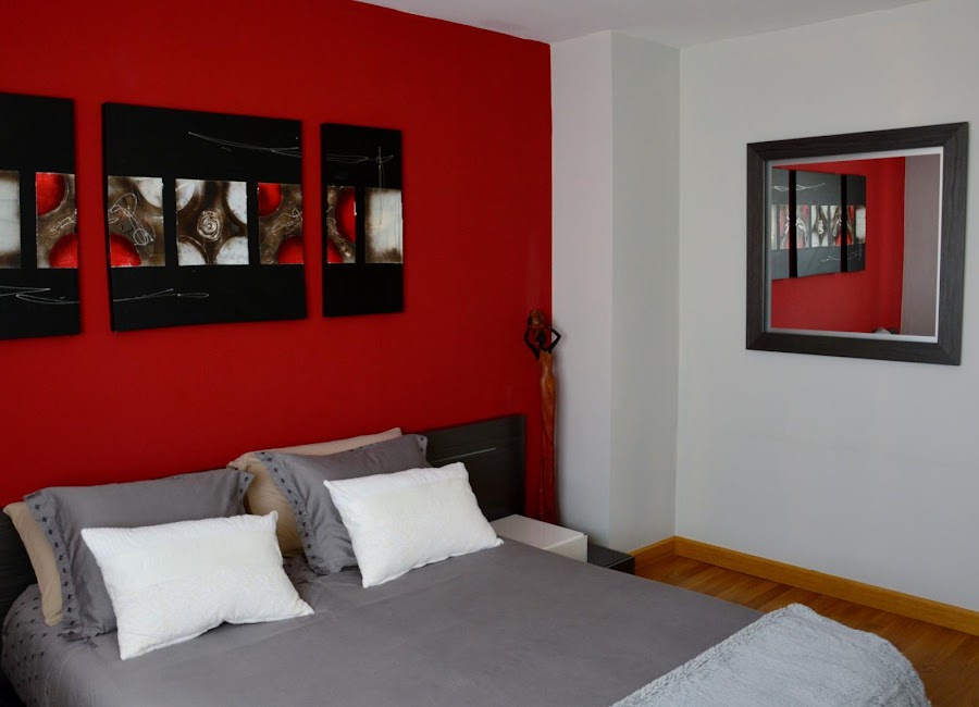 a conjunto con los cuadros del cabecero de la cama y la figura africana.