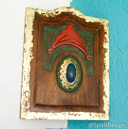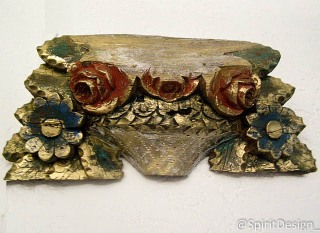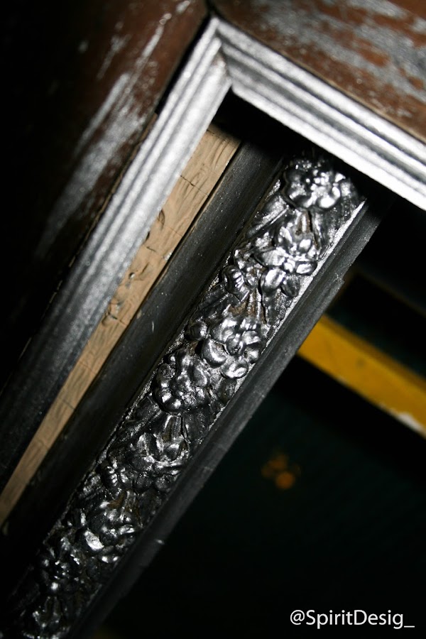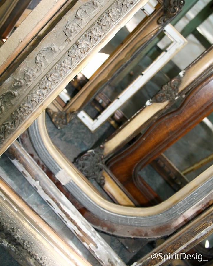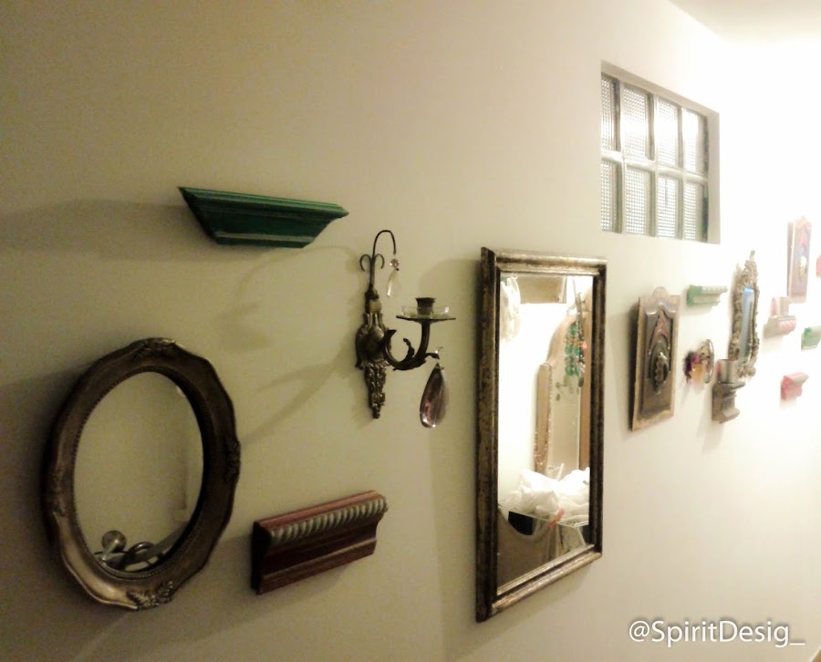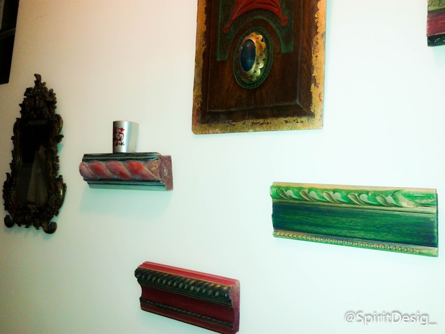 En convivencia con marcos antiguos restaurados a los que les pusimos espejos biselados, se usaron las molduras como mini estantes y exhibidores.
