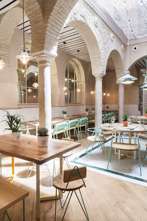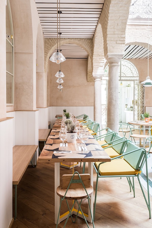 Su interiorismo ha sido ejecutado por el estudio Lucas y Hernández-Gil y no ha podido ser más acertado, han conservado toda la esencia de la construcción y dejado a la vista los elementos que se habían ocultado con el paso de los años, el precioso patio andaluz central lleno de arcos, la sala revestida de azulejos tan propio de Sevilla, una vuelta al pasado en el que el mobiliario ha puesto el toque de modernidad que lo hace tan especial. Piezas de diseño con toques nórdicos e industriales se mezclan a la perfección con la arquitectura sevillana tradicional. Os dejo con la imágenes que publicó en su día AD para que os hagáis una idea de lo que os cuento y podáis descubrir este precioso lugar.