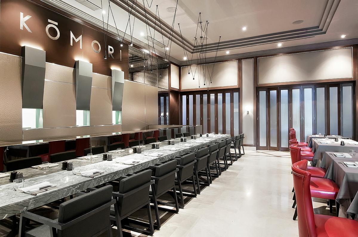 En Valencia nos encontramos el restaurante Komori especializado en comida japonesa. Se puede disfrutar de un ambiente moderno, puro de líneas y elegante como la comida que allí sirven. La lámpara colgante Match, de Vibia, diseñada por Jordi Vilardell y Meritxell Vidal, actúa como elemento escultórico suspendido sobre la mesa comunitaria de mármol.