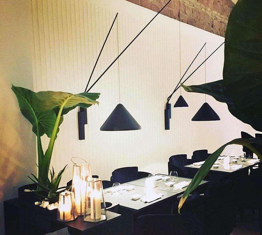 Este restaurante cuenta con un diseño geométrico donde se traza finas siluetas que recuerdan a una tela de araña contra el telón de fondo de los antiguos techos de ladrillo visto. También nos encontramos mesas iluminadas con la lámpara colgante North, que proyectas sombras oscuras que ayudan a definir cada mesa.
