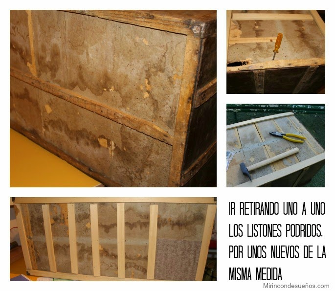 La segunda parte a restaurar ,era la base, corté unos listones nuevos con la misma medida de los antiguos, y fuí retirando y poniendo uno a uno, con clavos.