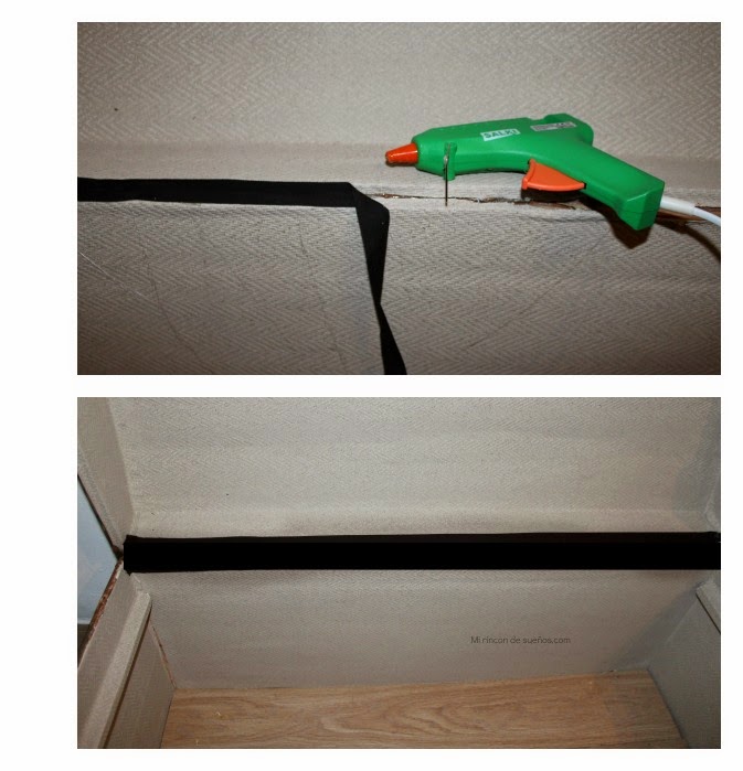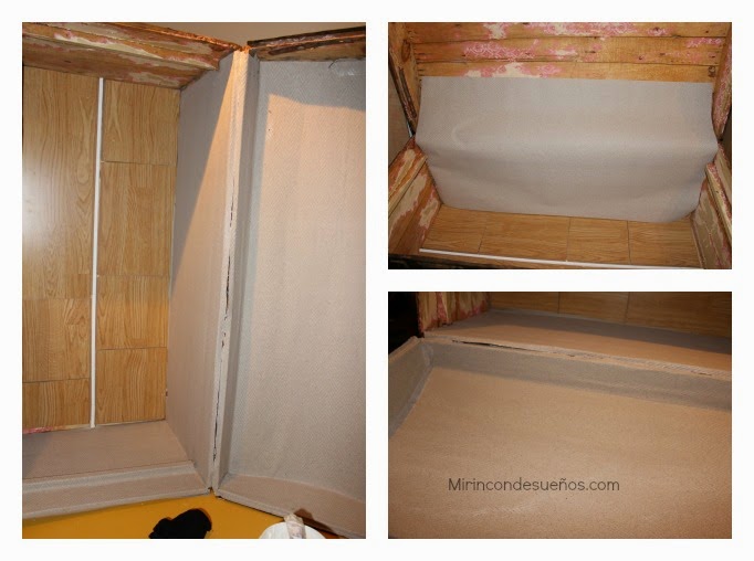 Una vez todo reforzado, pasamos a empapelar la zona interior, yo he usado papel de pared, de efecto tela, en un color beige.