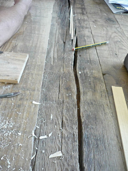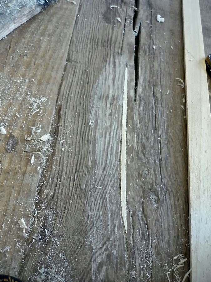 Lo podemos restaurar con pequeñas "filetes de madera" que cortamos a medida para ir rellenando los huecos, sin forzar. Trabajamos pequeñas secciones para facilitar que se adapten al hueco de la grieta, y para alisarlas utilizaremos un formón afilado.