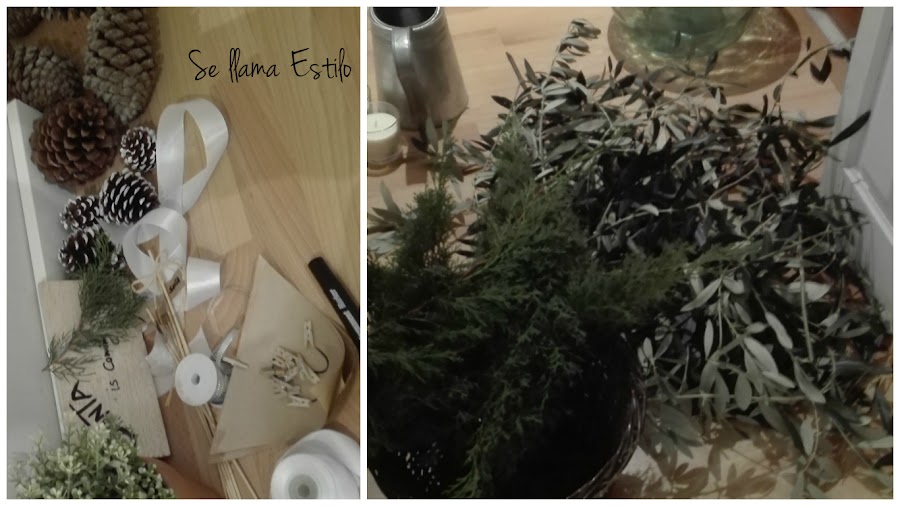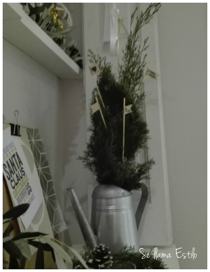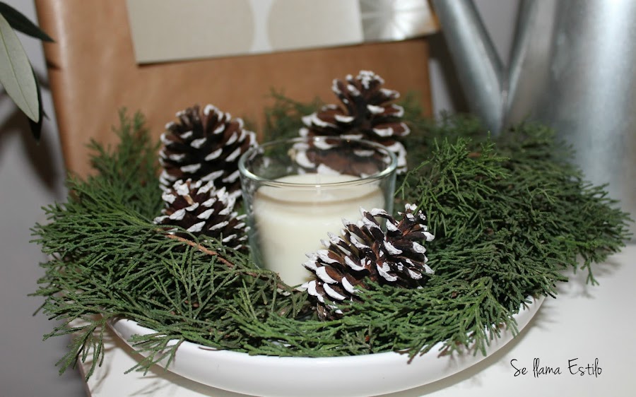 Sobre el banco, tenemos un pequeño centro de mesa con ramas de ciprés, pequeñas piñas y una vela de vainilla. También tenemos una regadera donde se ha improvisado un mini arbol de navidad, con ramas de ciprés, decorado de una manera muy sencilla, pequeños banderines de papel de kraft.