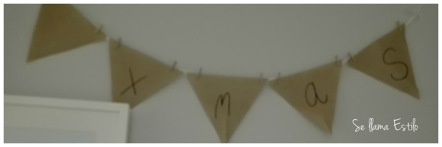 Muy sencillo, pero vistoso. Papel de kraft cortado en triangulo, escrito con rotulador negro, la cuerda es lana blanca y los triángulos se sujetan con pequeñas pinzas de madera.