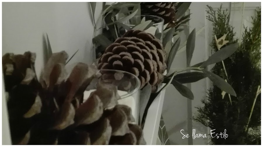 Los estantes están cubiertos con ramas de olivo. En el estante superior sobre las ramas se apoyan dos láminas enmarcadas, en el otro estante tenemos el calendario, la parte libre esta decorada con piñas y velas de vainilla.