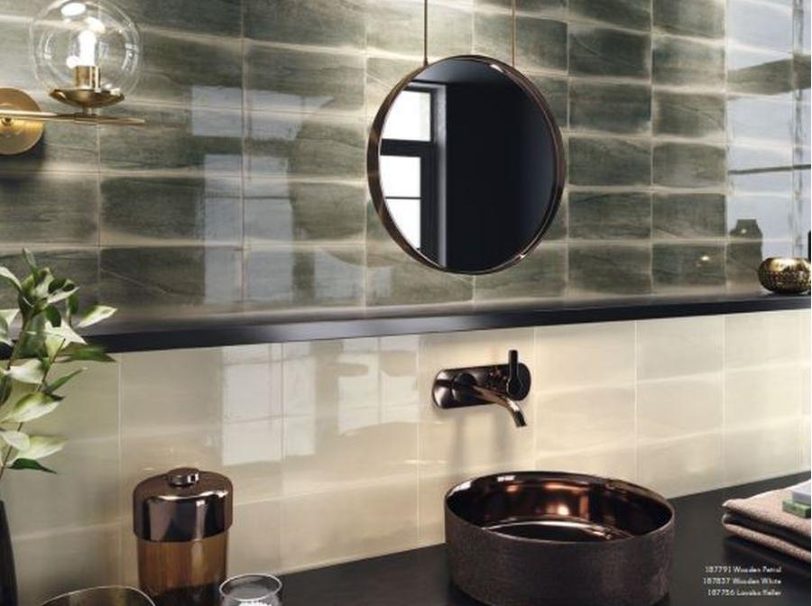Revestimiento Forma en forma de Bisel de Dune Cerámica Por último, este revestimiento de pasta blanca es perfecto para conseguir reflejos y ganar en iluminación dentro del cuarto de baño. En este baño se han empleado dos modelos diferentes en blanco y negro para crear un contraste que consigue dar elegancia al cuarto de baño.