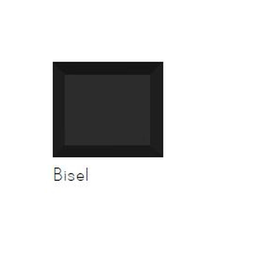 Revestimiento porcelánico Diurne Sand Rec de Dune Cerámica El revestimiento biselado, tal vez, sea una de las opciones más habituales. Con orígenes en el metro de Nueva York, estos azulejos han ido evolucionando con el paso de los años en formas y acabados. En este caso, podemos ver un biselado negro para revestir la parte inferior de la pared del baño.