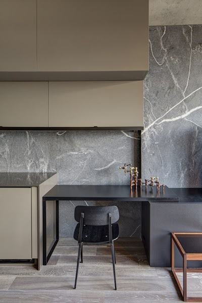 Referencia aparte merece la formidable pared frontal, compuesta por losas de granito Silver Fox gris con pronunciadas vetas claras, que se extienden a lo largo de la pared uniendo visualmente la cocina y el salón, logrando un lugar más acogedor y moderno.