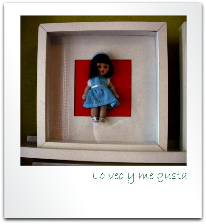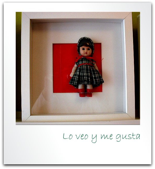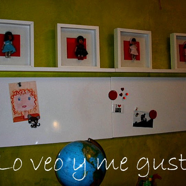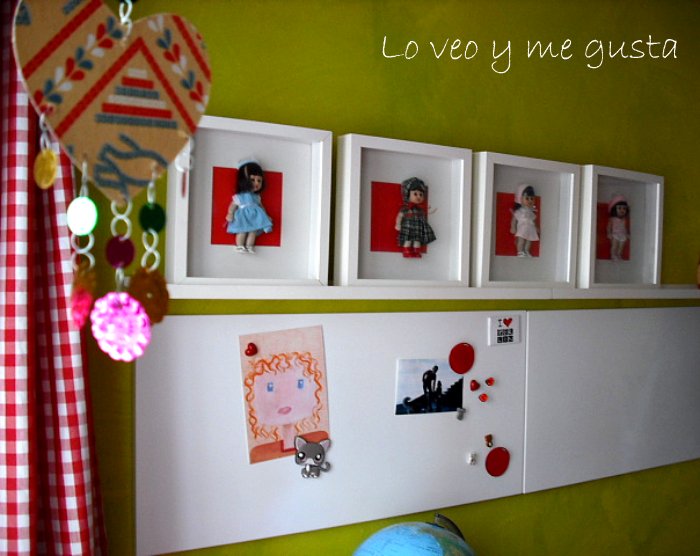 Los marcos Ribba de Ikea en forma de vitrina fueron la mejor opción para sacarles partido y poder incluirlas en la decoración del dormitorio. Los estantes Ribba sirvieron para exponer los marcos con las muñecas