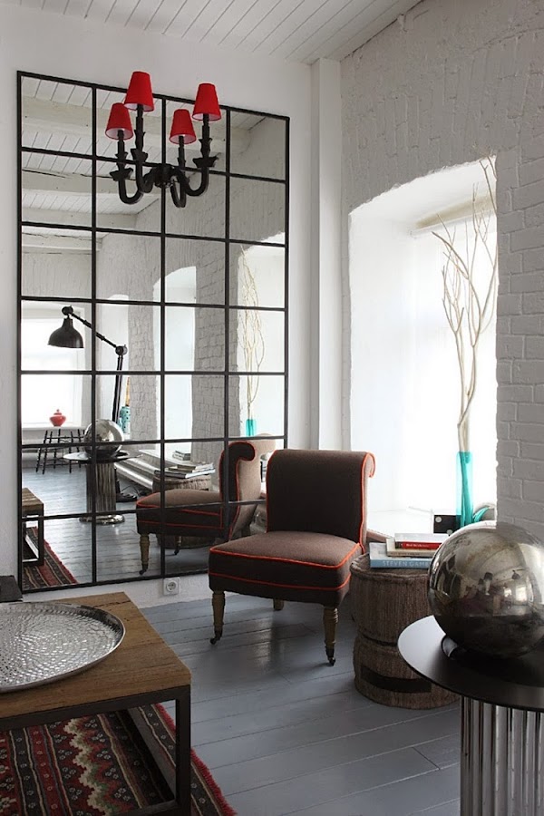 Hoy otro rincón para inspirarse, suelos y techos en madera blanca, ladrillos pintados, mucha luz natural y un maravilloso espejo que llama la atención de toda la estancia.