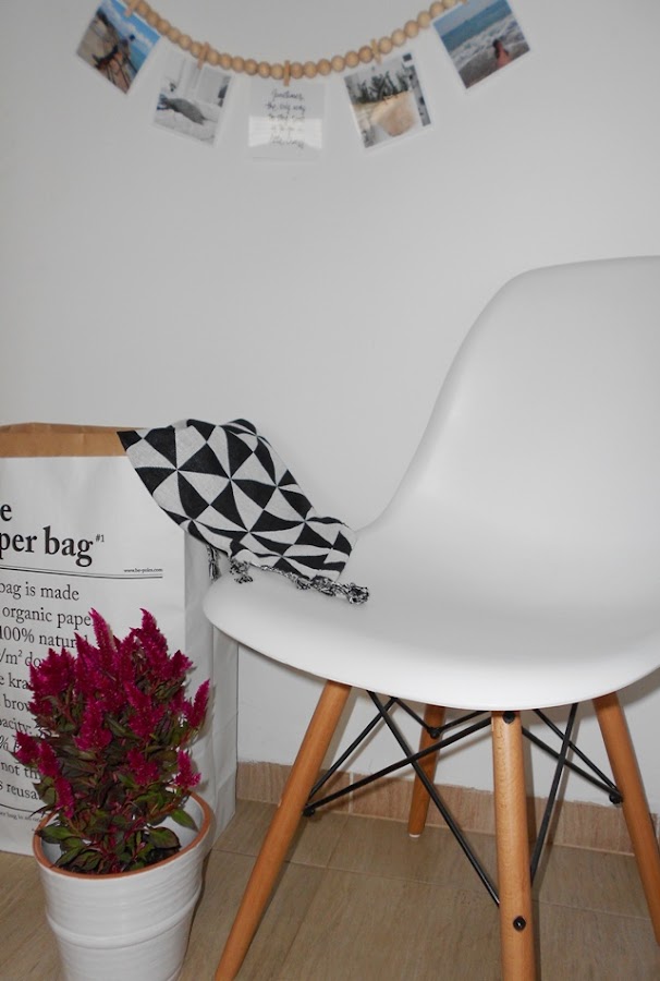 Simplemente puse la silla para ver como quedaría, y me gusto tanto el resultado que le busqué atrezzo con una plantita preciosa que compré, la paper bag que tenía, y además, con unas fotitos que imprimí de mi Instagram gracias a Polabox, una tienda online en la que puedes imprimir tus fotos de redes sociales directamente, y en unos días, las recibes en formato polaroid, una caña!
