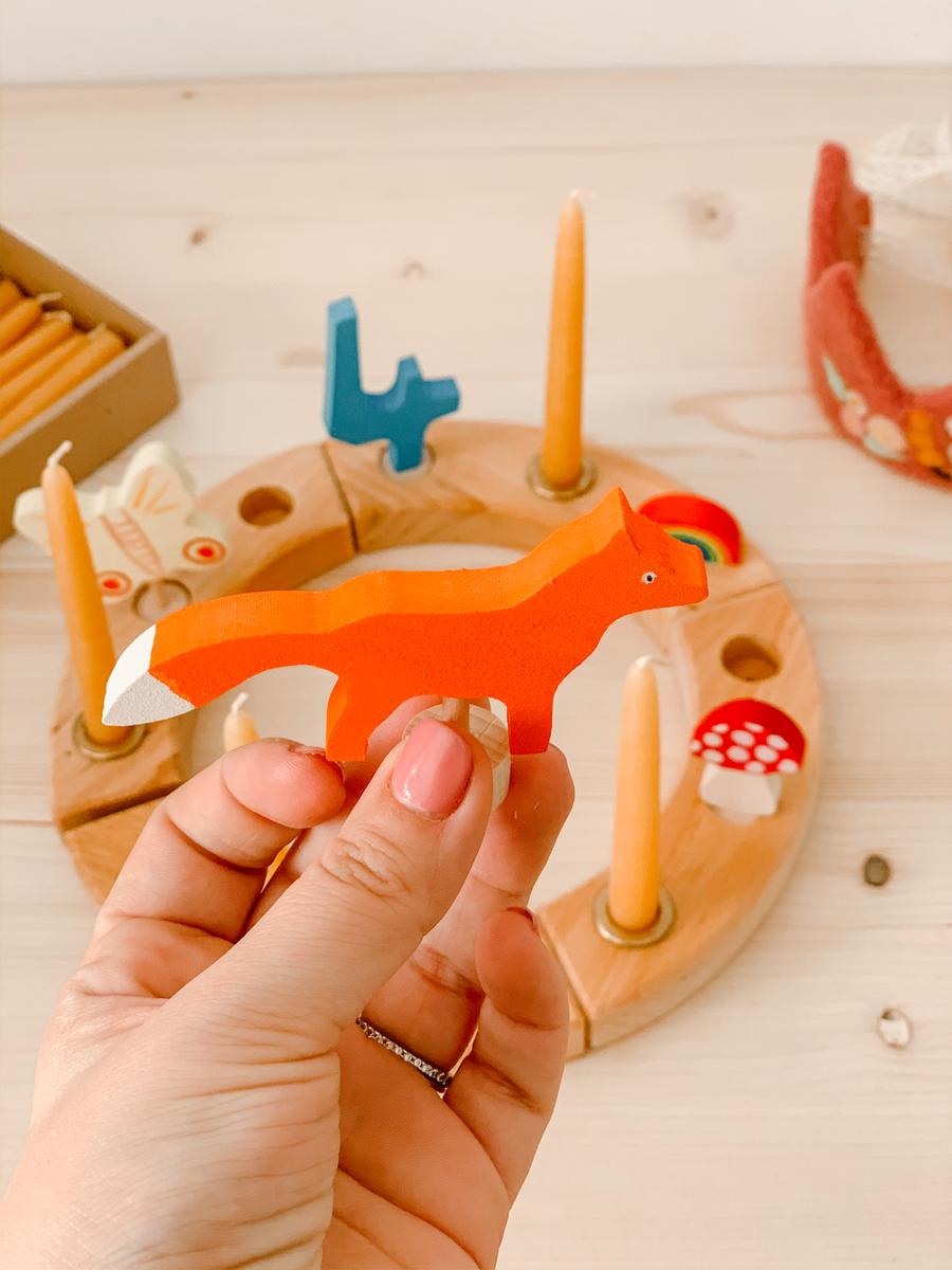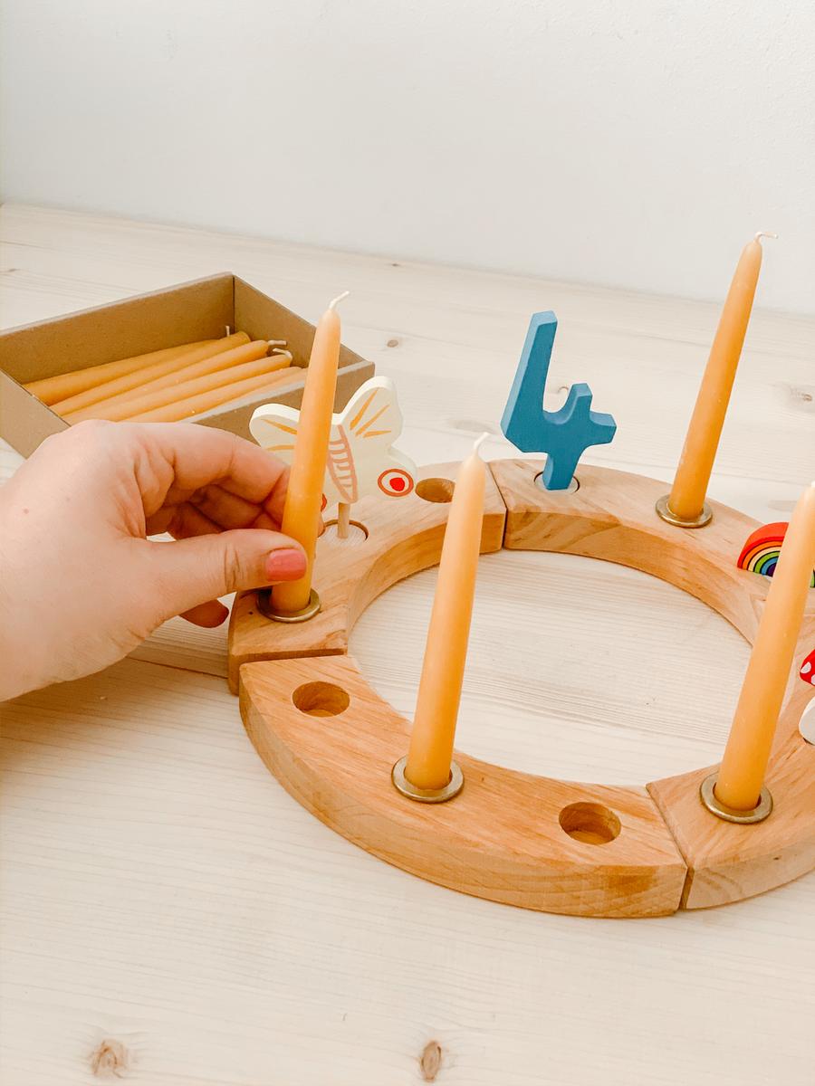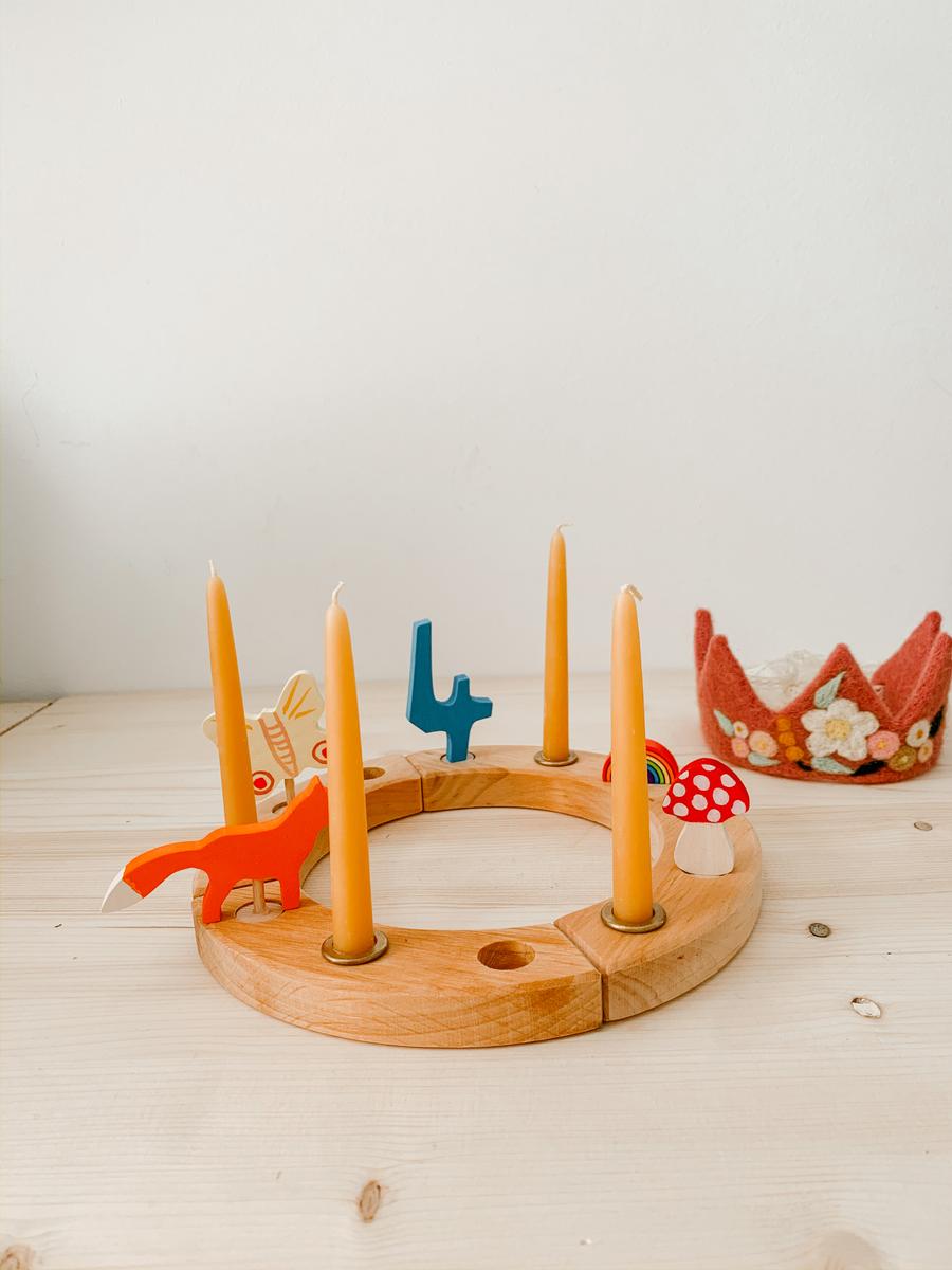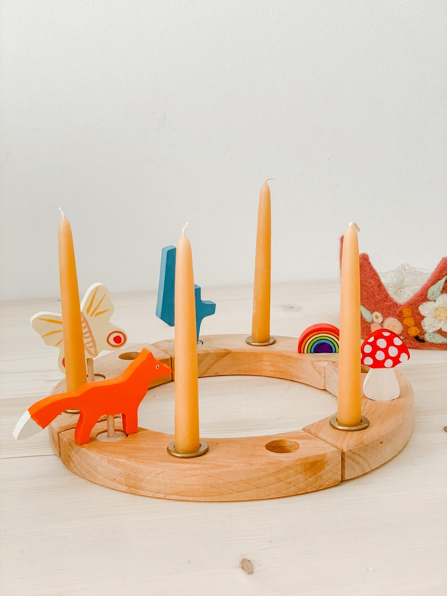 Lo encontré en LoraLora. Se trata de un círculo de madera hecho con cuatro piezas y tres agujeros en cada una de ellas. Las combinaciones son muchas y cómo utilizarlo y con qué son tan personales como la familia que vaya a usarlos. Cada uno puede crear su pequeño ritual. Yo escogí la pieza con el número 4 , 4 velas y 4 elementos que tuvieran algún simbolismo para ella. En esta ocasión he sido yo quién lo ha escogido, porque queríamos que fuera una sorpresa, pero quizás el año que viene le proponemos a ella que escoja su siguiente figura o únicamente añadimos una vela más.