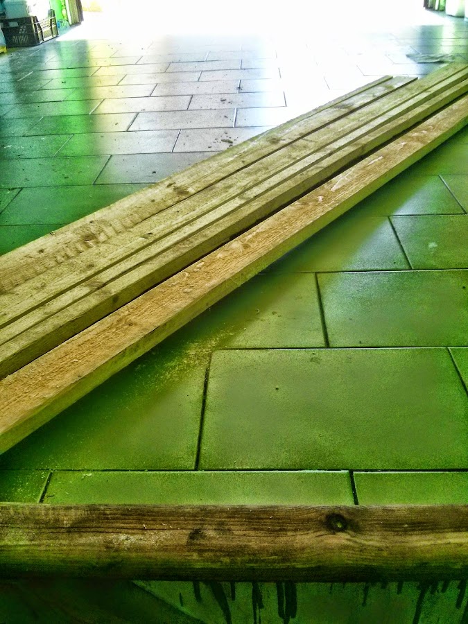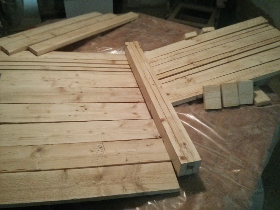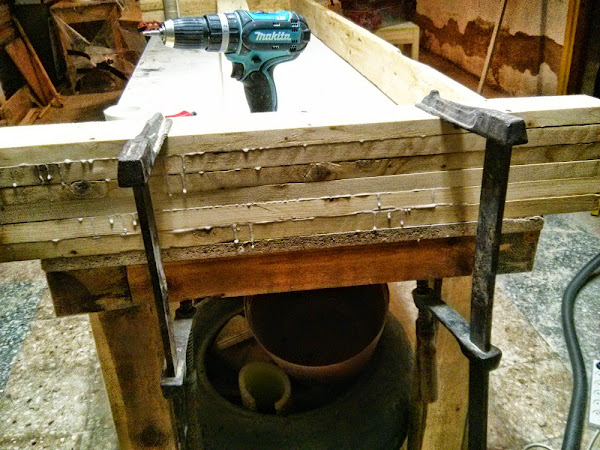 Para las realizar las patas de la mesa utilizamos las mismas tablas que para la estructura, solo que unimos tres piezas con cola resistente a la humedad y tirafondos. Como el invierno en Burgos es duro la mesa se ha hecho de tal forma que las patas se pueden extraer de forma sencilla para almacenarla mucho mejor.