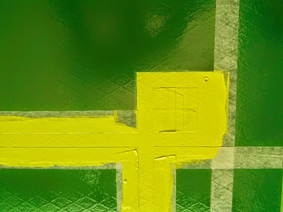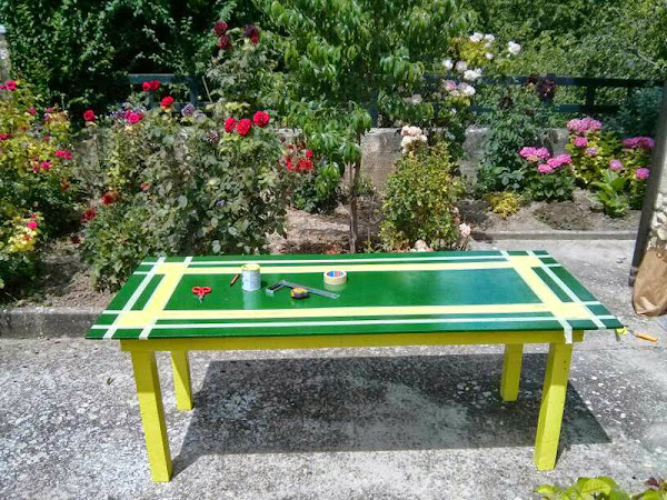 El último paso fue la pintura. Las patas y estructura las pintamos de verde pistacho, y la tapa de verde césped. Solo con eso quedaba bien, pero le faltaba algo, así que cogimos cinta de carrocero y nos liamos la manta a la cabeza. El dibujo geométrico que elegimos es sencillo pero le da ese toque especial que necesitaba la mesa.