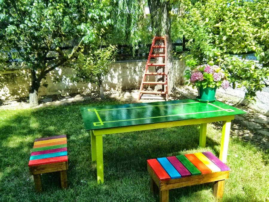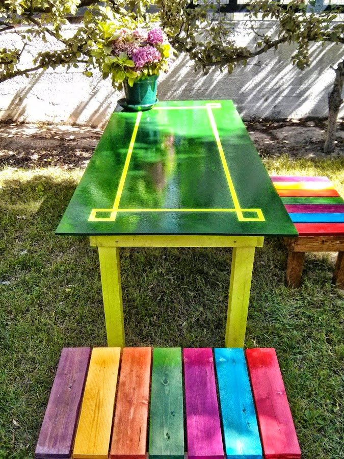 Hace tiempo hicimos unos bancos de colores con mucha personalidad y para completar el mobiliario del jardín decidimos crear una mesa sencilla pero robusta.