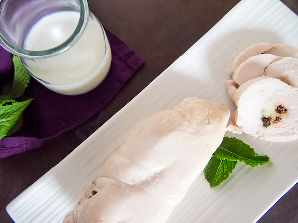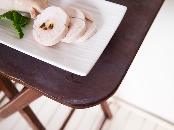 He de decir que es la segunda vez que la hago y la primera lo mismo hace 10 años que la probé por lo que no voy a ser capaz de deciros de dónde la saqué, supongo que de alguna revista tipo El Semanal que eran las que por aquella época me nutrían de recetas. Yo me quede con la base pechuga cocida en film transparente, lo demás es pura intuición.
