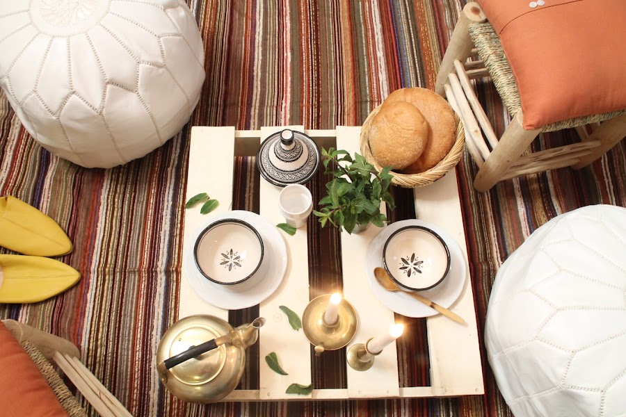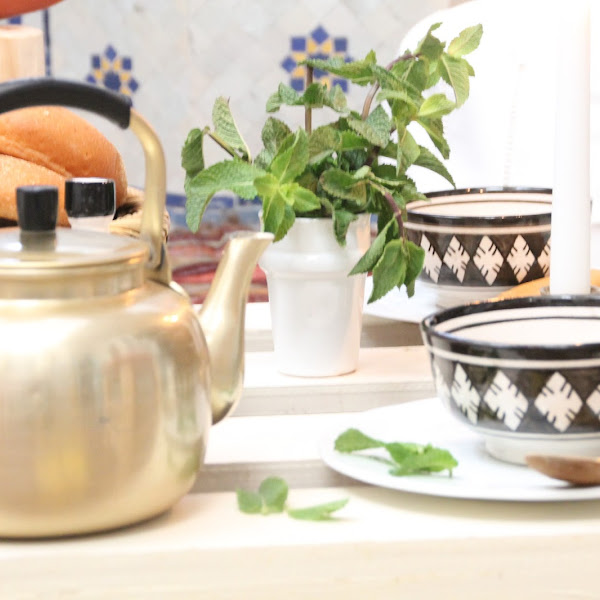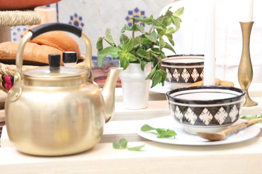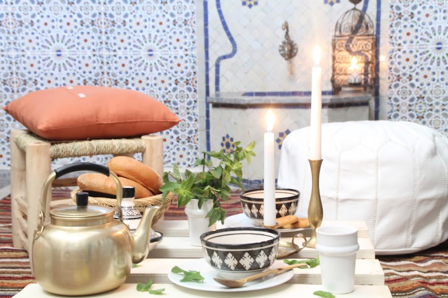 Si habéis estado alguna vez en un riad marroquí, sabréis que a la caída de la tarde los patios principales se llenan de preciosos farolillos con una luz tenue que junto al relajado ruido de las fuentes nos invitan a un momento de descanso. Para el desafío de Blad de este mes queríamos ofrecer un ambiente sosegado, de calma y espiritualidad, que gira en torno al ritual del té. El olor a hierbabuena, el pan recién horneado y las cosas sencillas y cotidianas (pero no por ello menos bonitas) de la tradicional vida marroquí nos han cautivado una vez más.