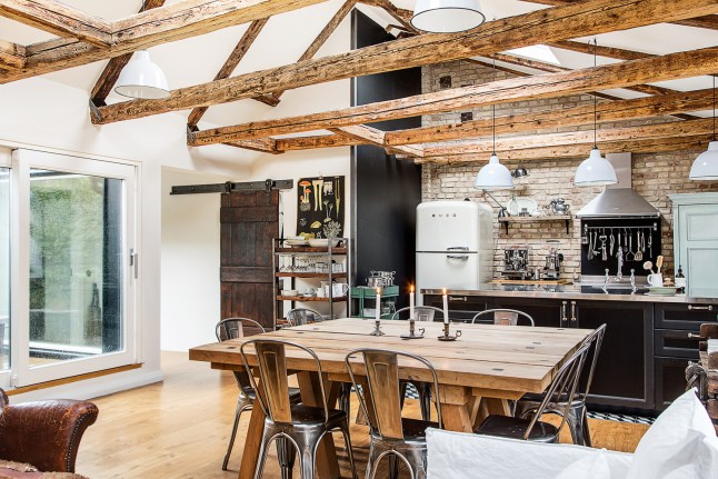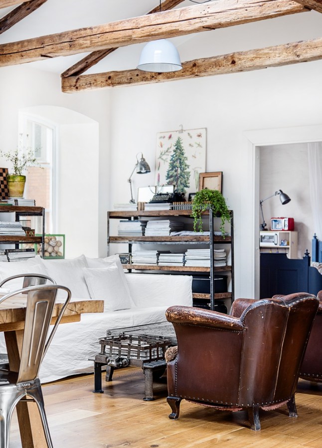 Rustico e industrial, una fusión que verdaderamente me gusta. El estilo rustico no es un estilo que me atraiga mucho pero tengo que admitir que cuando lo veo me vienen a la cabeza recuerdos de cosas que me gustan como el campo, los bosques, las montañas, un buen fuego en el que refugiarse... y quizás no me atraiga por lo mismo que os he comentado antes, porque me cierro yo mismo a muchas posibilidades. En este piso podemos ver elementos que tiran hacia ese estilo rustico que os cuento, como la mesa del comedor que recuerda a una mesa de esas que podemos encontrar en los merenderos, o la puerta corredera que se asemeja a la de un granero, los utensilios de cocina colgados que hacen que recuerdes guisos y comidas propias de un pueblo, los muebles algo mas clásicos que aportan confortabilidad o la madera de vigas y suelo con un aspecto mas "bruto" que recuerda a una cabaña en el campo....
