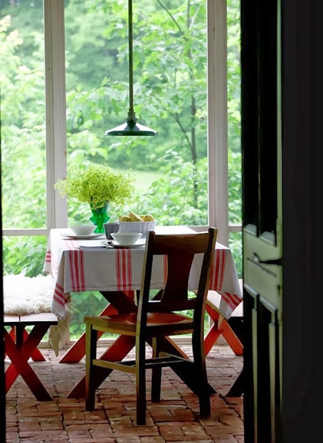 Su interior incorpora además de algunos elementos de diseño europeos, un montón de detalles curiosos: suelo de ladrillo (nos rechifla!), bancos hechos a medida para acompañar a la mesa de comedor, o el mueble de madera (con su vajilla encontrada en anticuario y que originalmente pertenecía a un hospital de la ciudad de Magog).