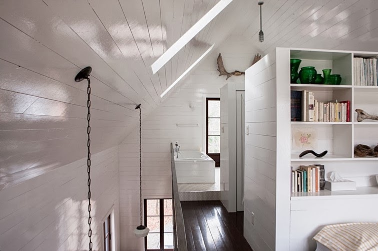 La escalera abierta comunica con una parte de arriba muy diferente, de estética loft, tenemos la zona de dormitorios y baños sobre una plataforma con barandillas de hierro a ambos lados, que le dan esa sensación industrial al espacio. Qué os parece el contraste?