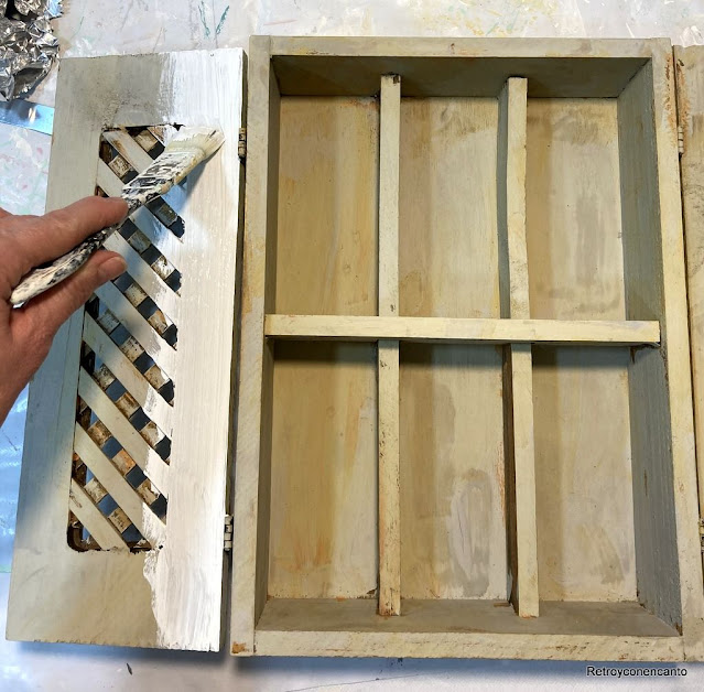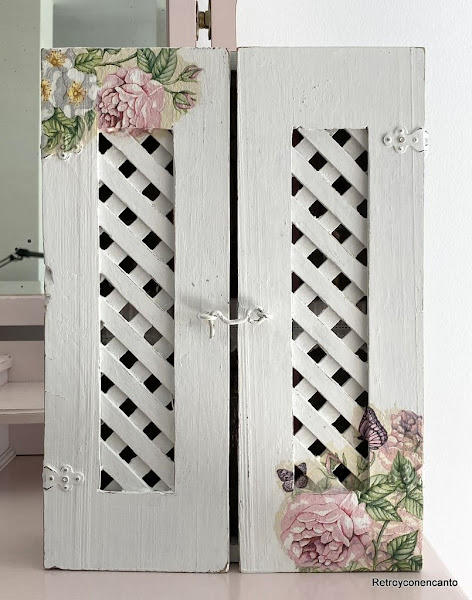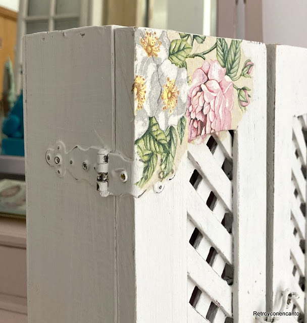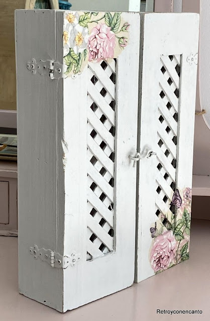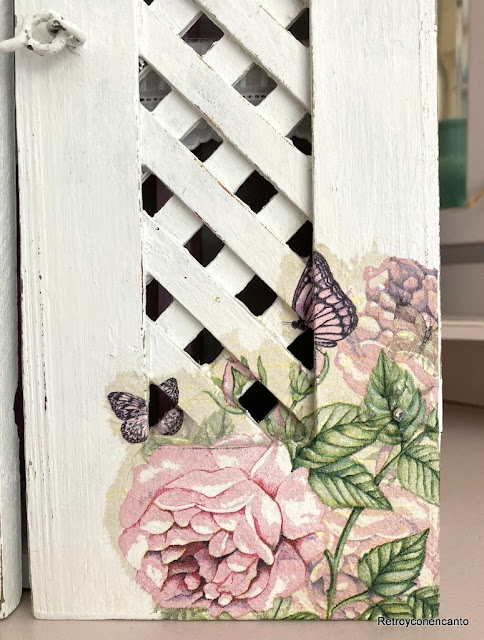 A la hora de enfrentarnos al exterior del mueblecito, el arrebato shabby fue en aumento, y se materializó en estos detalles en decoupage, tanto abajo...