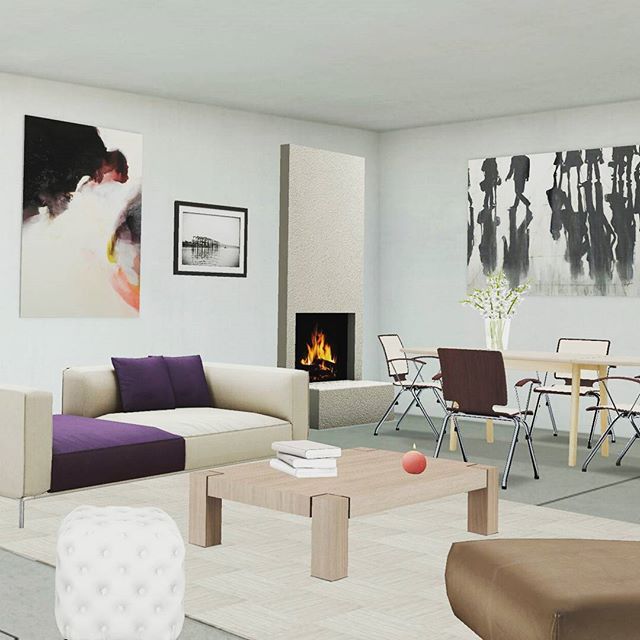 La pieza decorativa que rompe el color natural blanco de la estancia son los cojines morados del sofá que ponen un poco de color a la habitación junto con los cuadros de arte que se ajustan al color predominante del mobiliario cercano y los cuales son piezas que dominan el salón.